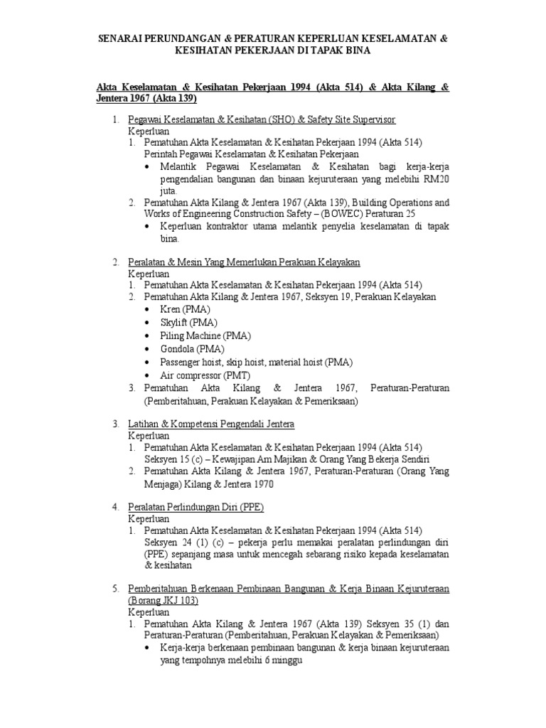 Senarai Perundangan Peraturan Keperluan Keselamatan Kesihatan Pekerjaan Di Tapak Bina 1