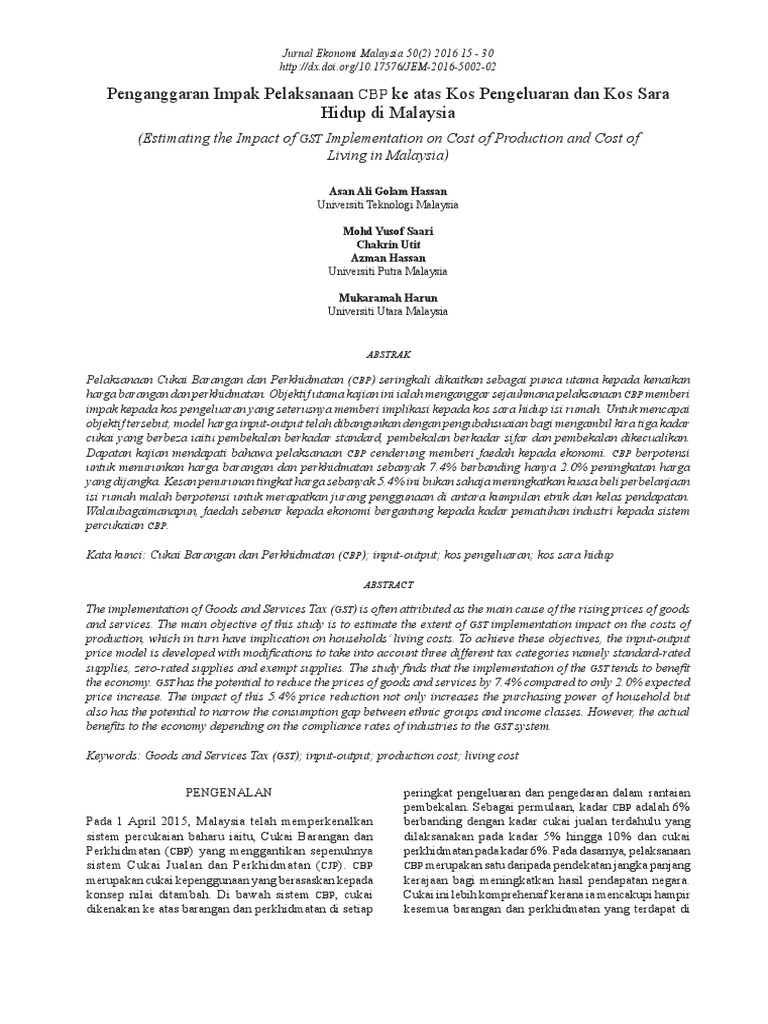 Penganggaran Impak Perlaksanaan Cbp Ke Atas Kos Pengeluaran Dan Kos Sara Hidup Di Malaysia Pdf By Mukaramah Harun